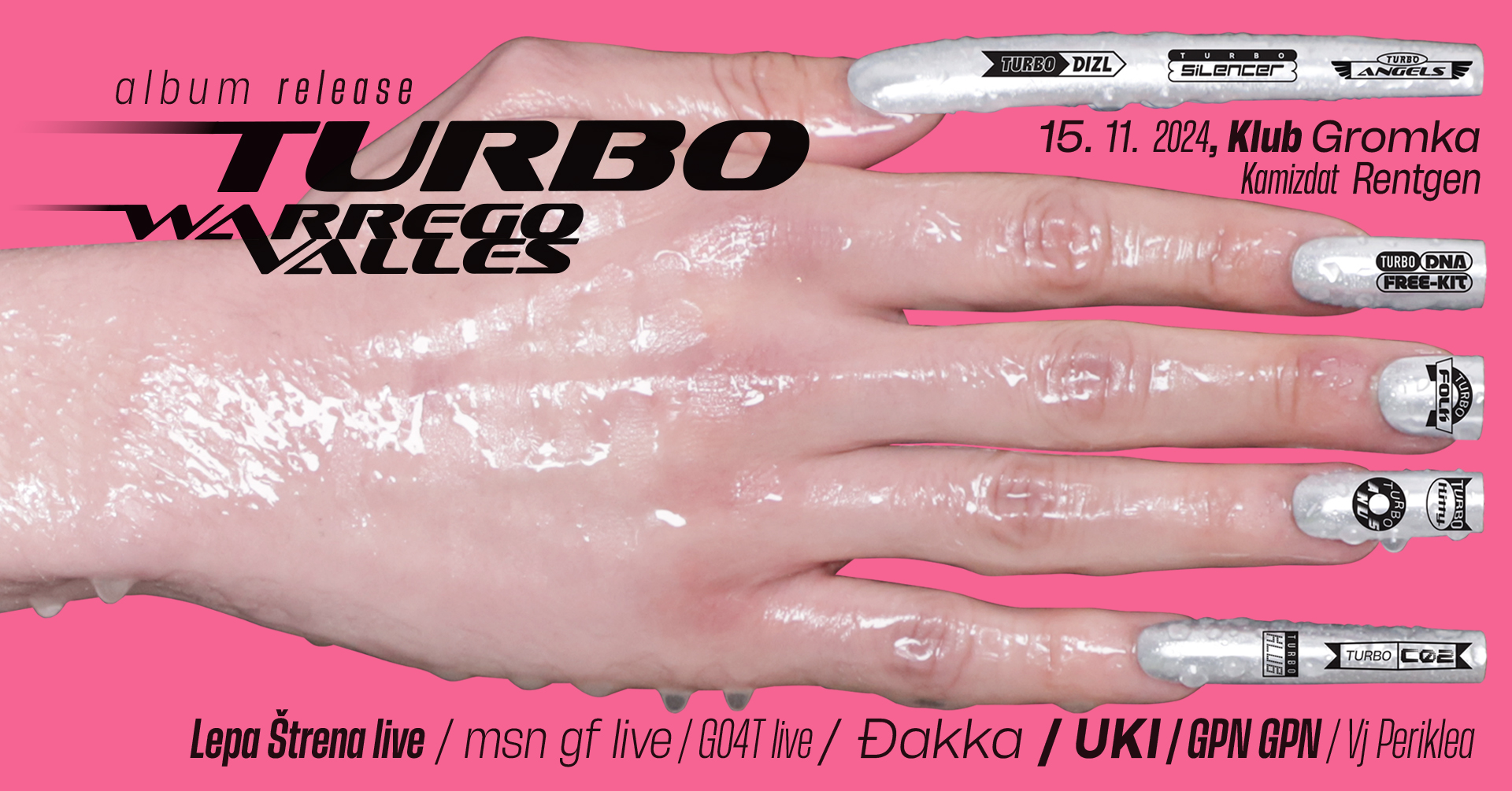 Na predzadnjem letošnjem Kamizdatovem Rentgenu Warrego Valles predstavljata “TURBO”, novi album, ki izide 15. 11. 2024 pri slovenski neodvisni spletni in butični založbi Kamizdat in sledi izdajam “Location Off” [2017], “Botox” [2018] in "save as" [2019]. Na 𝑻𝙐𝑹𝘽𝑶 𝒑𝙖𝒓𝙩𝒊𝙟𝒖 se jima bodo z live acti in dj nastopi pridružili: Lepa Štrena s svojim šarmantnim vokalom, msn gf in premierno GO4T s predstavitvijo avtorske produkcije, prvič rola UKI in le kaj bi na turbo partiju brez etabliranih GPN GPN in Đakke. Turbo mode ON!